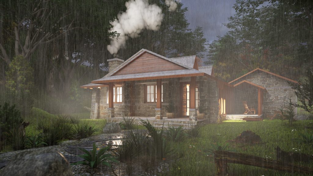 Locally inspired house designed to blend with its surroundings. It includes a living room with fireplace, kitchen/dining, four bedrooms, a personal theatre, and two bathrooms. The layout is divided into two parts: the front with the living and dining areas, and the back with a central courtyard encircled by bedrooms and the theatre. The façade features exposed stone for a natural aesthetic.